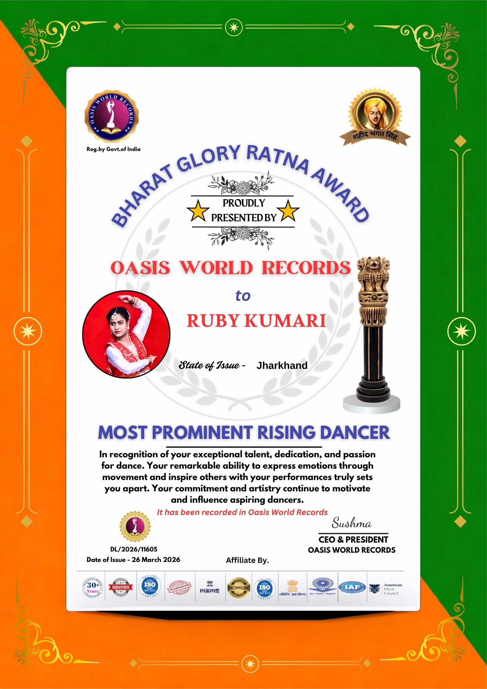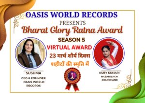 рд╣рдореЗрдВ рдпрд╣ рдмрддрд╛рддреЗ рд╣реБрдП рдЕрддреНрдпрдВрдд рдЧрд░реНрд╡ рд╣реЛ рд░рд╣рд╛ рд╣реИ рдХрд┐┬аRuby Kumari┬ардХреЛ┬аBharat Glory Ratna Award┬ард╕реЗ рд╕рдореНрдорд╛рдирд┐рдд рдХрд┐рдпрд╛ рдЧрдпрд╛ рд╣реИ, рдЬрд┐рд╕реЗ┬аOasis World Records┬арджреНрд╡рд╛рд░рд╛ рдкреНрд░рджрд╛рди рдХрд┐рдпрд╛ рдЧрдпрд╛ рд╣реИред