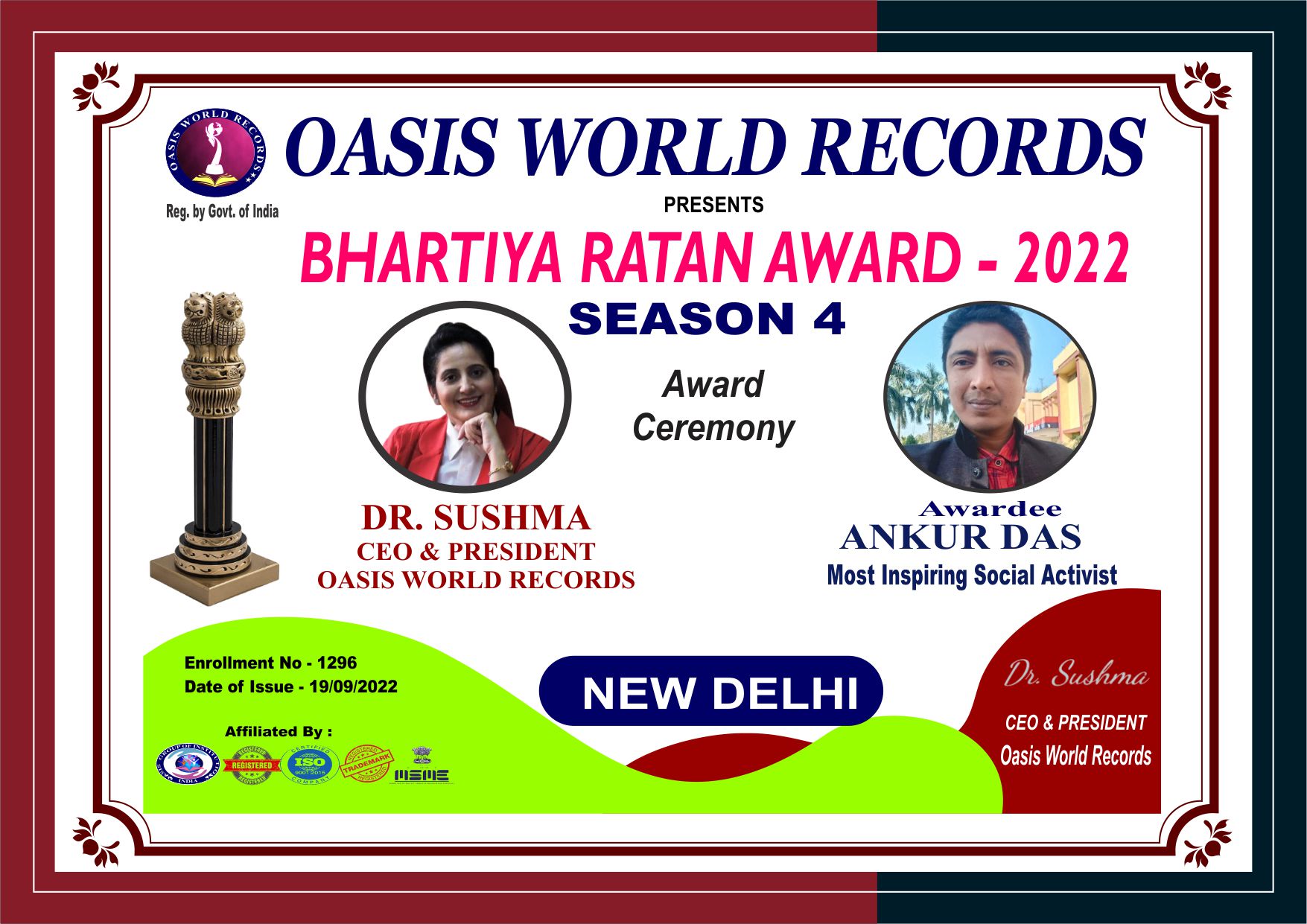 Bhartiya Ratan Award Presented to Ankur Das for her excellent work, outstanding performance and remarkable role in the field of Social Work which is helpful in transforming the Nation.