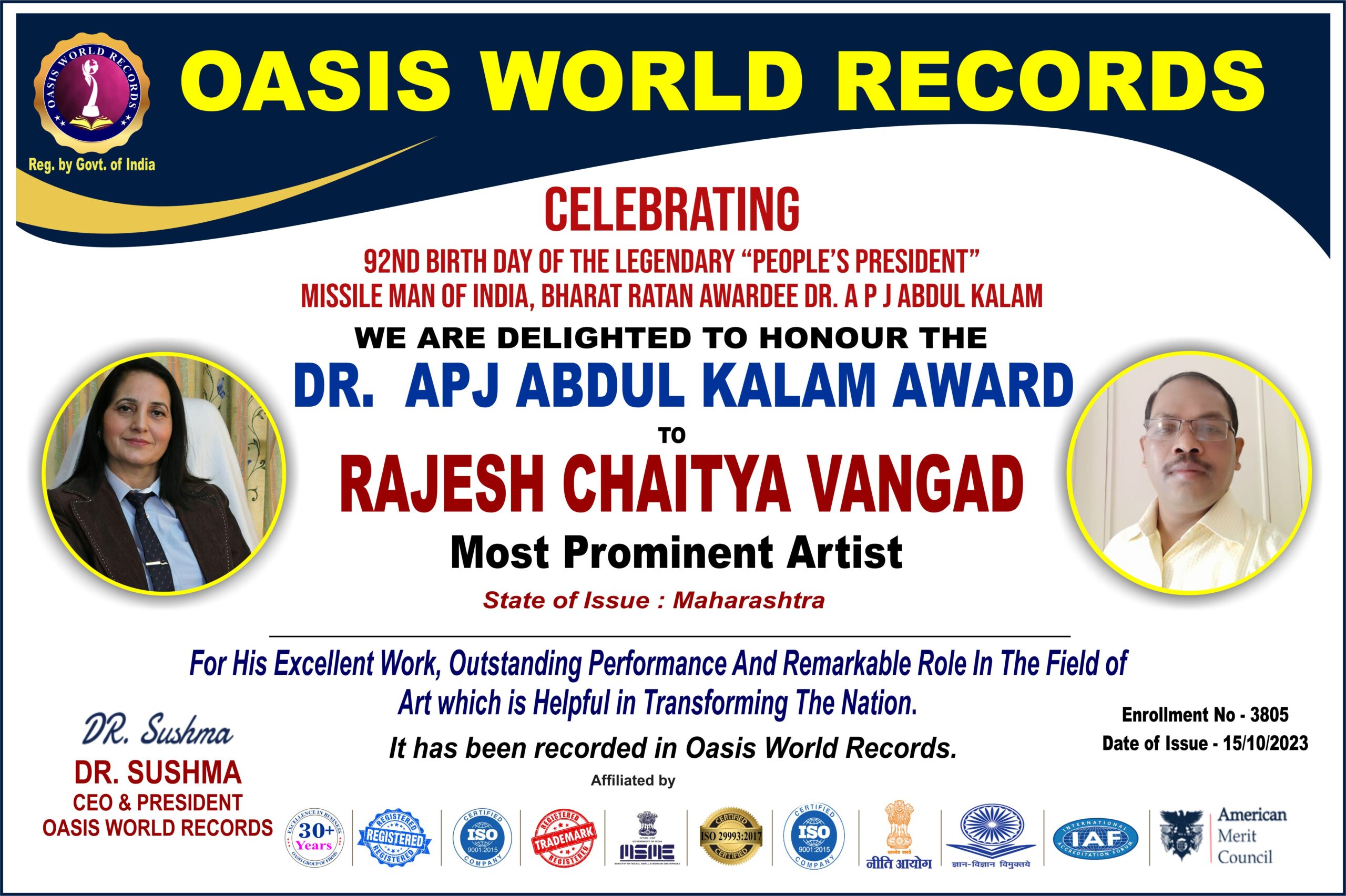 DR. APJ ABDUL KALAM Awardee – Rajesh Chaitya Vangad – Most Prominent Artist – for his excellent work, outstanding performance and remarkable role in the field of Art which is helpful in Transforming the Nation.