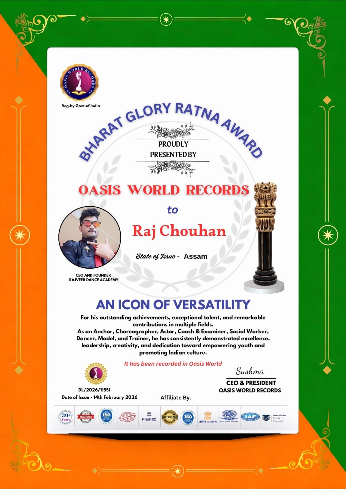 This prestigious Bharat Glory Ratna Award 2026 is proudly presented to Mr. Raj Chouhan (Assam) in recognition of his outstanding achievements, exceptional talent, and remarkable contributions in multiple fields.