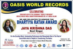 Bharatiya Ratan Awardee – Jaya Krishna Das – Best Singer – for her excellent work, outstanding performance and remarkable role in the field of Literature which is helpful in Transforming the Nation.