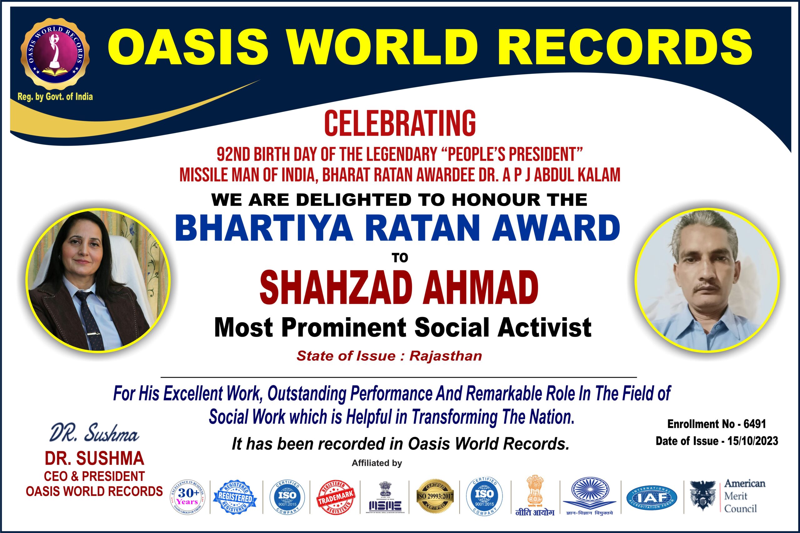 Bhartiya Ratan Awardee – Shahzad Ahmad – Most Prominent Social Activist – for his excellent work, outstanding performance and remarkable role in the field of Social Work which is helpful in Transforming the Nation.