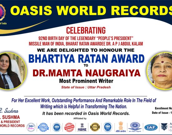 Bharatiya Ratan Awardee – Dr. Mamta Naugraiya – Most Prominent Writer – for her excellent work, outstanding performance and remarkable role in the.