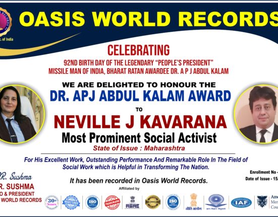 Dr. APJ Abdul Kalam Awardee – Neville J Kavarana – Most Prominent Social Activist – for his excellent work, outstanding performance and remarkable.