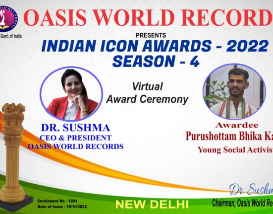 Indian Icon Award presented to Purushottam Bhika Kale for his excellent work, outstanding performance and remarkable role in the field of Social Services.