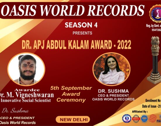 DR. APJ Abdul Kalam Award is presented to DR. M. VIGNESHWARAN for his excellent work, outstanding performance and remarkable role in the field.