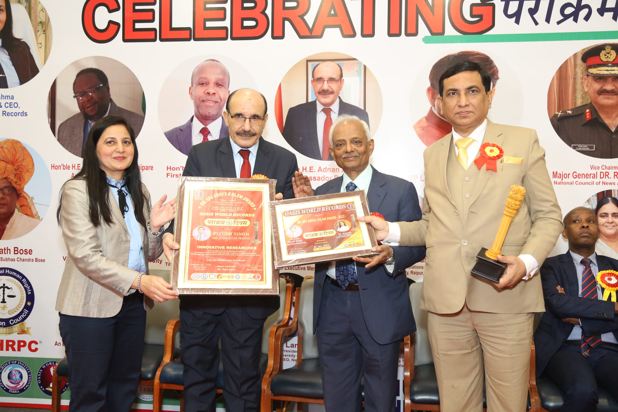 DR. APJ Abdul Kalam Award presented to Piyush Singh For his excellent work, outstanding performance and remarkable role in the field of Strategic planning , leadership & plant operations in machined components, cd & automobile domain and also made special purpose machines (spm) which is helpful in transforming the nation.