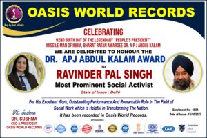DR. APJ ABDUL KALAM Awardee – Ravinder Pal Singh – Most Prominent Social Work – for his excellent work, outstanding performance and remarkable role in the field of Social Work which is helpful in Transforming the Nation.