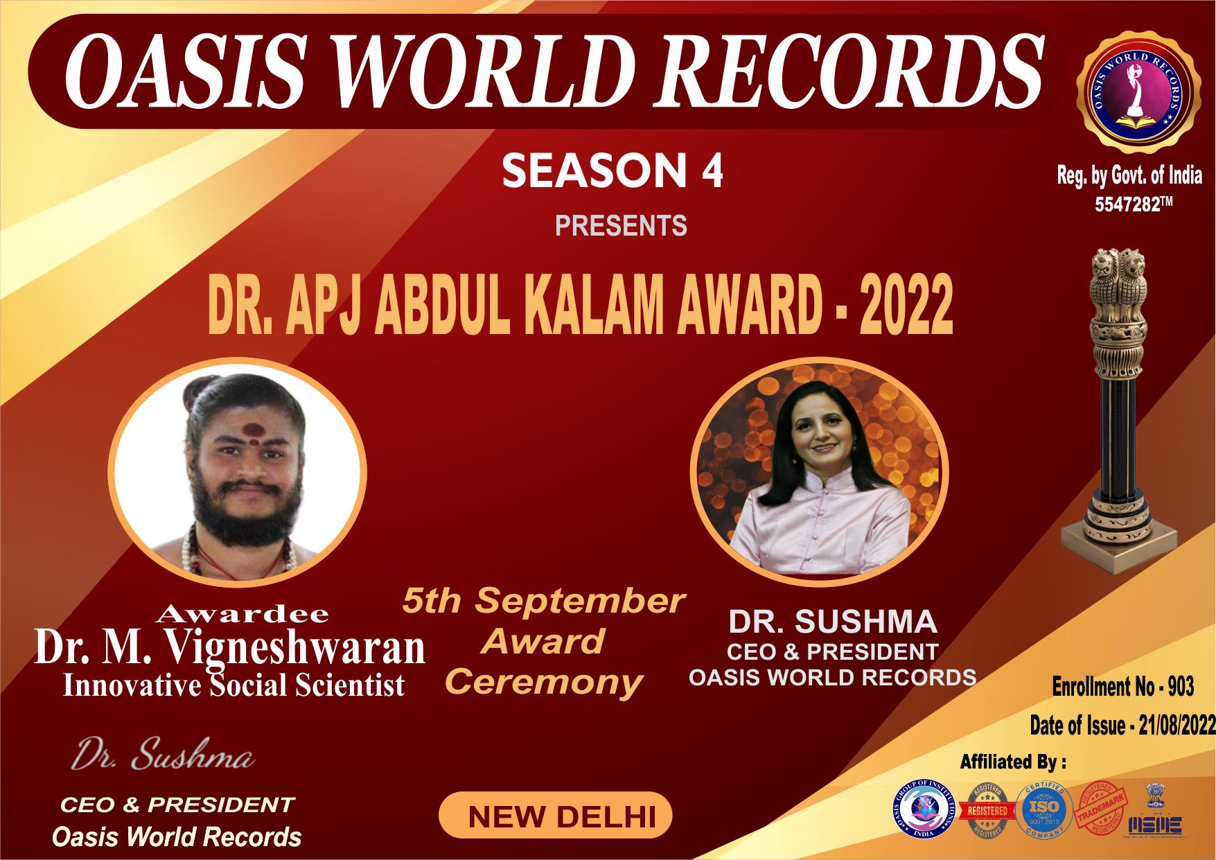 DR. APJ Abdul Kalam Award is presented to DR. M. VIGNESHWARAN for his excellent work, outstanding performance and remarkable role in the field of Social Science which is helpful in transforming the Nation.
