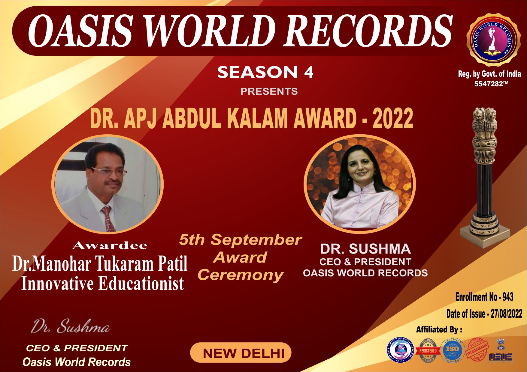 DR. APJ Abdul Kalam Award is presented to DR. MANOHAR TUKARAM PATIL for his excellent work, outstanding performance and remarkable role in the field of Education which is helpful in transforming the Nation.