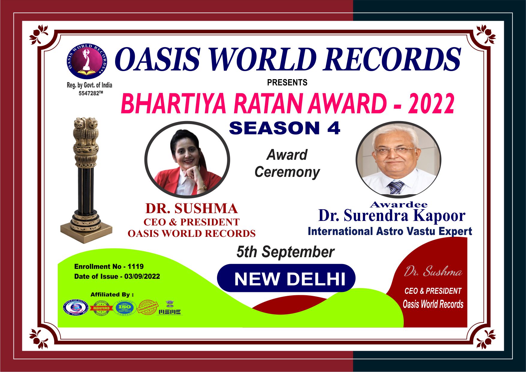 Bhartiya Ratan Award Presented to DR. SURENDRA KAPOOR for his excellent work, outstanding performance and remarkable role in the field of Astrology & Vastu which is helpful in transforming the Nation.