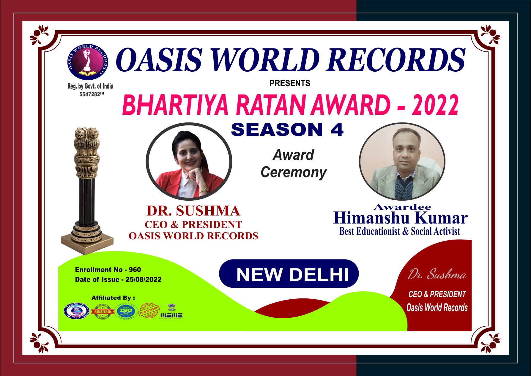 Bhartiya Ratan Award Presented to HIMANSHU KUMAR for his excellent work, outstanding performance and remarkable role in the field of Education & Social Work which is helpful in transforming the Nation.