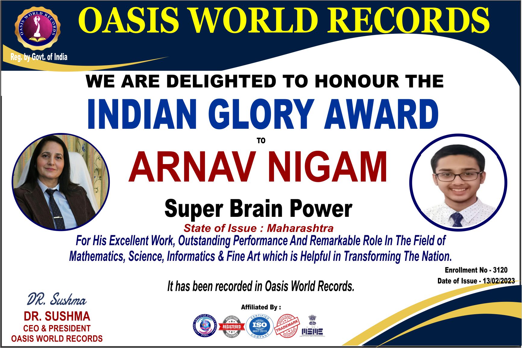 For His Excellent Work, Outstanding Performance And Remarkable Role In The Field of Mathematics, Science, Informatics & Fine Art which is Helpful in Transforming The Nation.