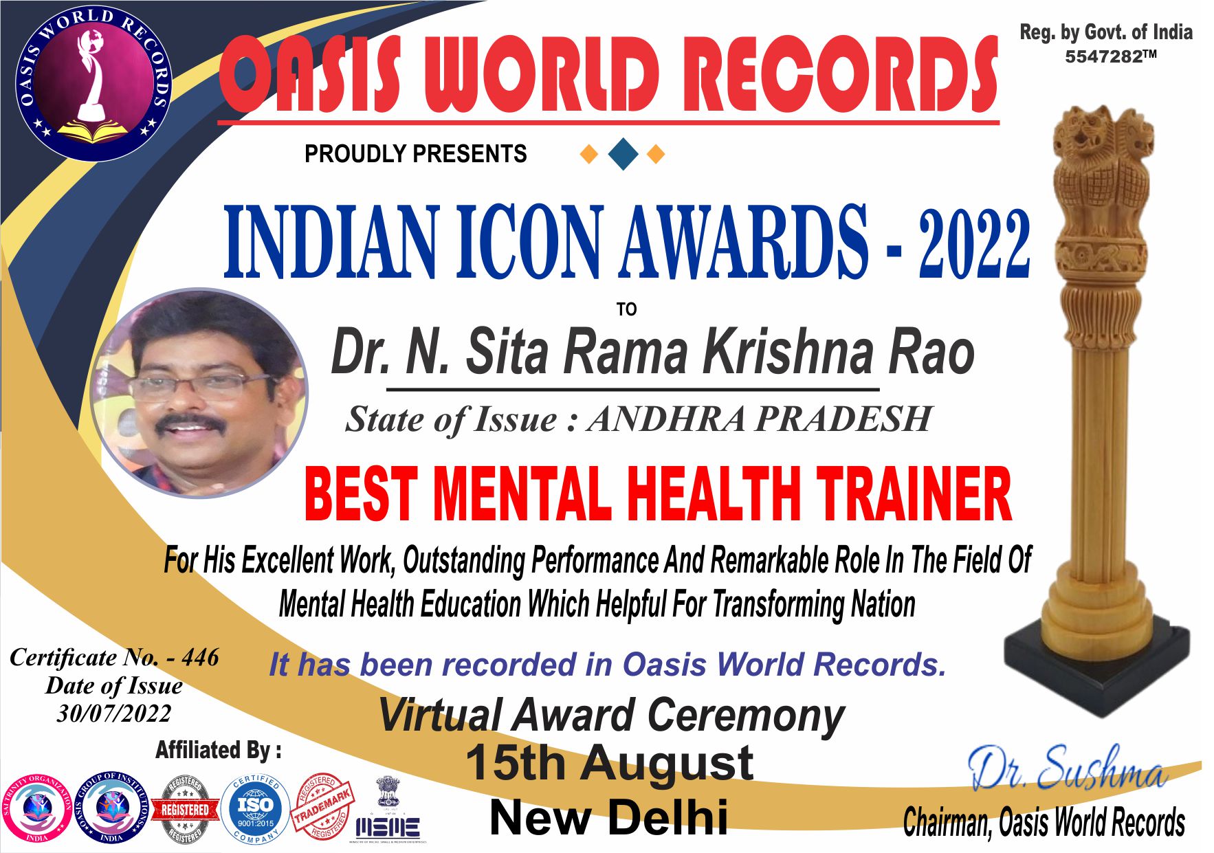 Indian Icon Award 2022 presented to Dr. N. Sita Rama Krishna Rao