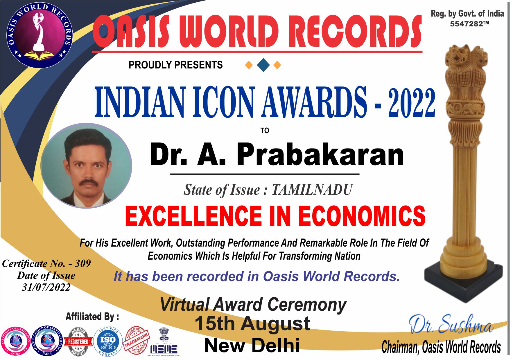 Indian Icon Award 2022 presented to Dr. A. Prabakaran