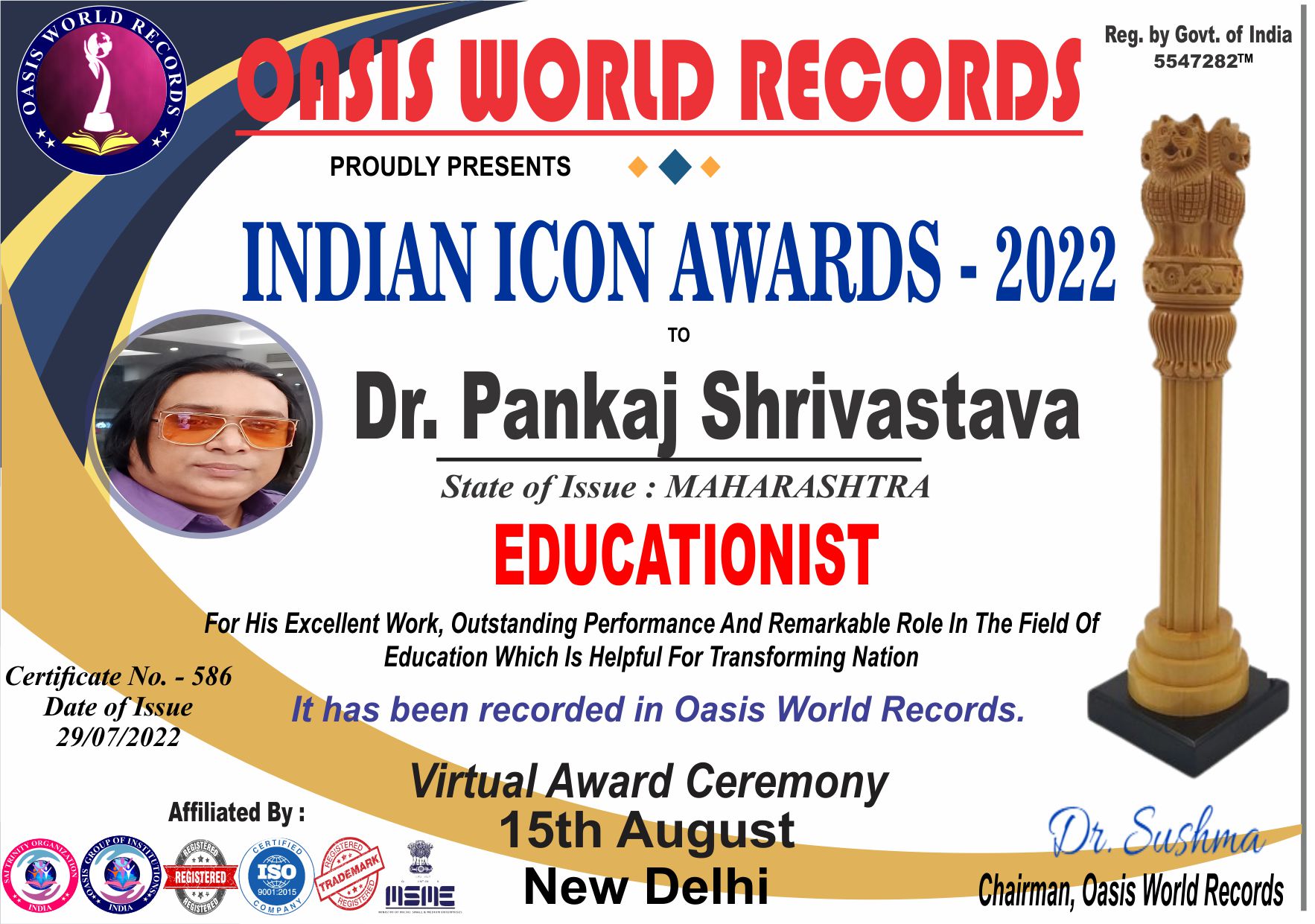 Indian Icon Award 2022 presented to Dr. Pankaj Shrivastava