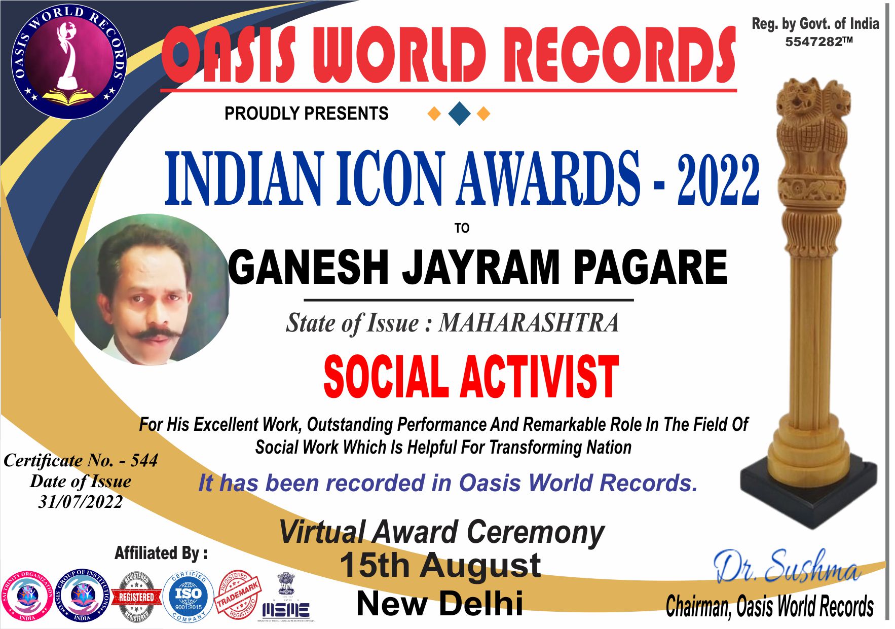 Indian Icon Award 2022 presented to Ganesh Jayram Pagare
