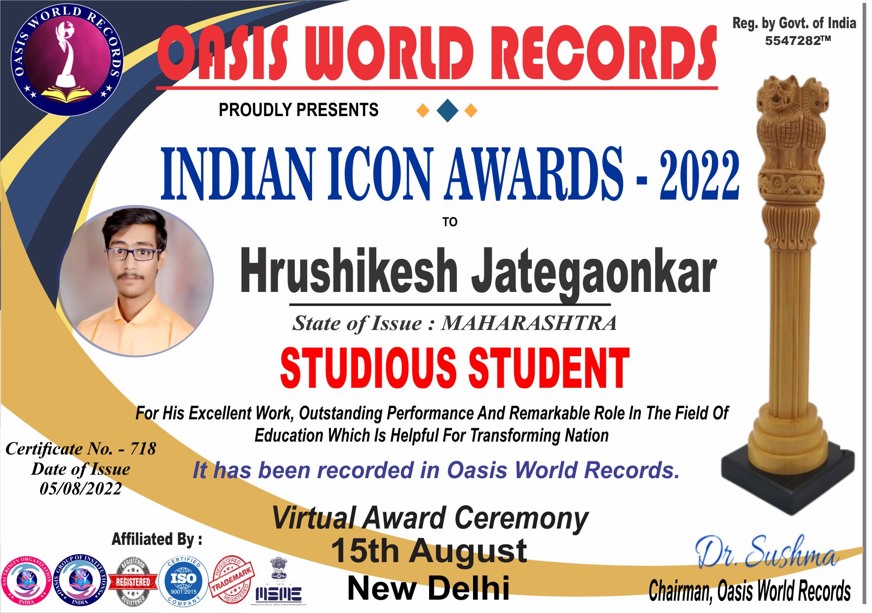 Indian Icon Award 2022 presented to Hruhikesh Jategaonkar