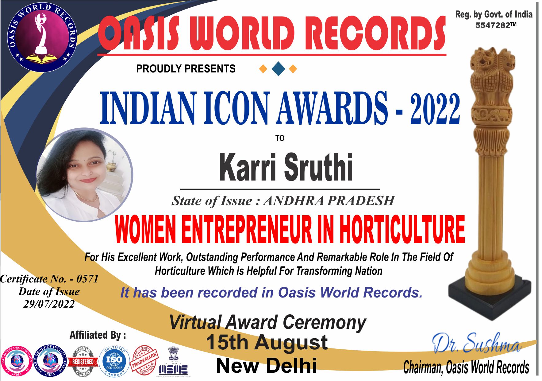 Indian Icon Award 2022 presented to Karri Sruthi