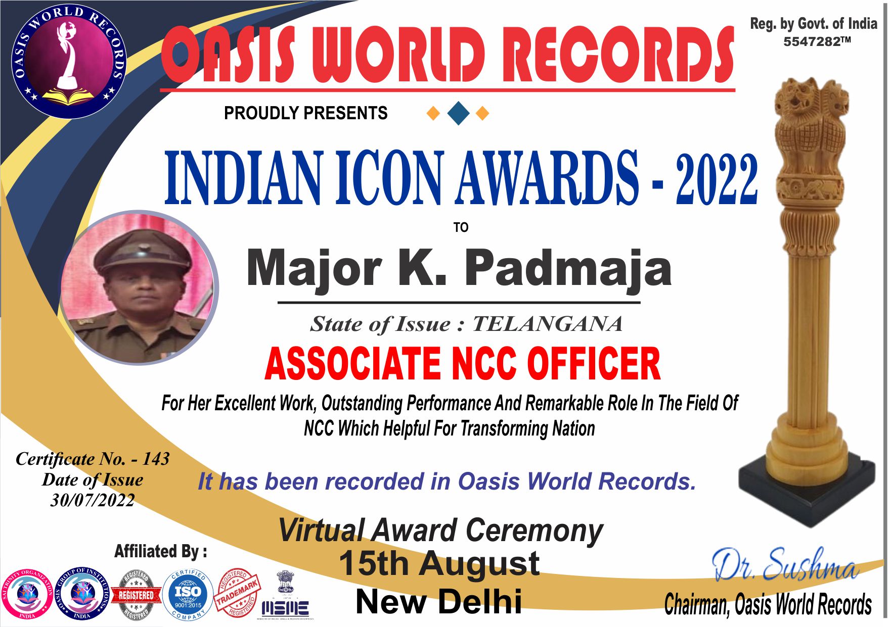 Indian Icon Award 2022 presented to Major K. Padmaja