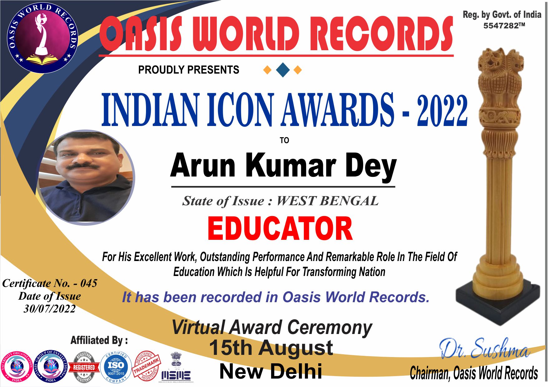 Indian Icon Award 2022 presented to Arun Kumar Dey