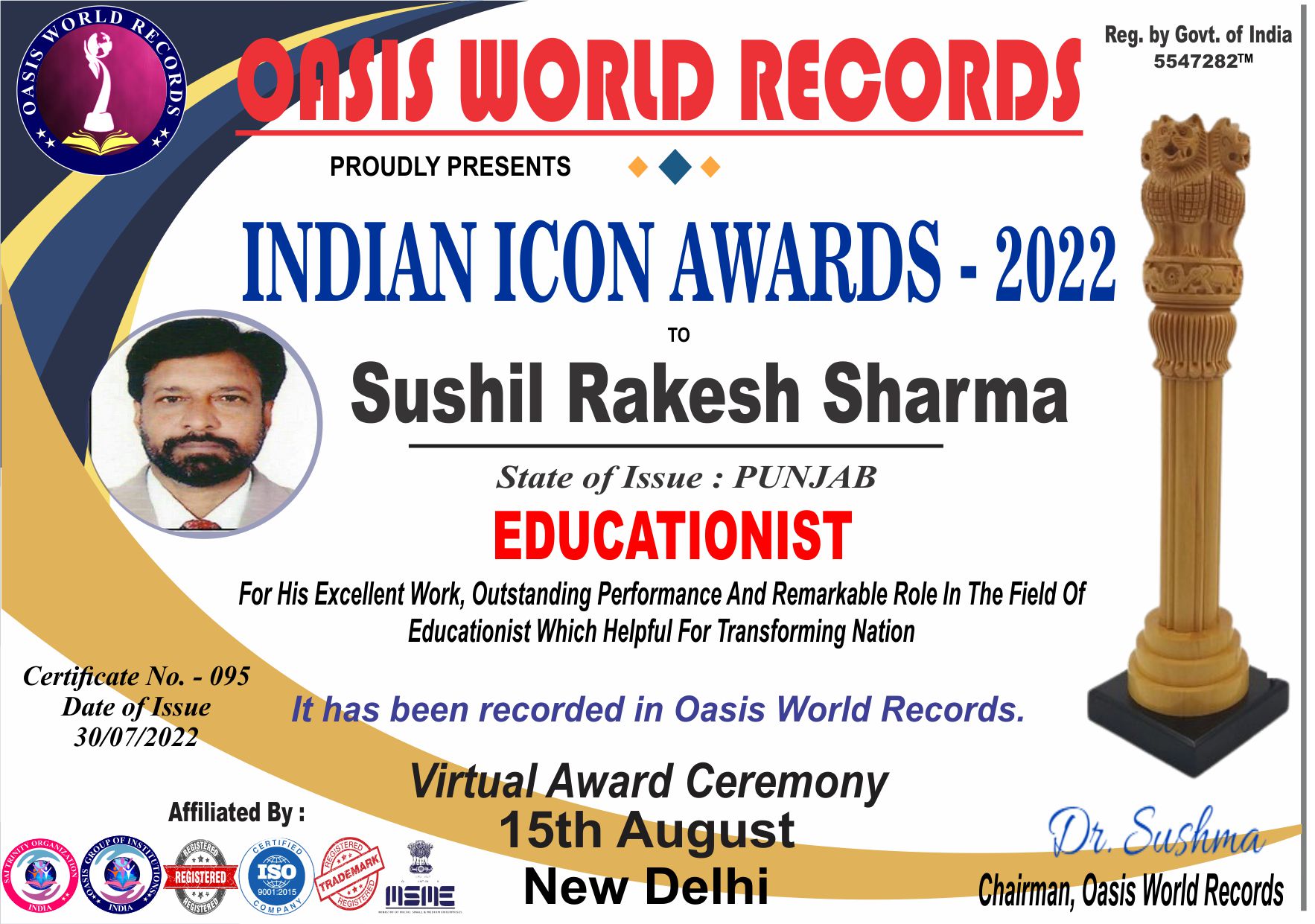 Indian Icon Award 2022 presented to Sushil Rakesh Sharma