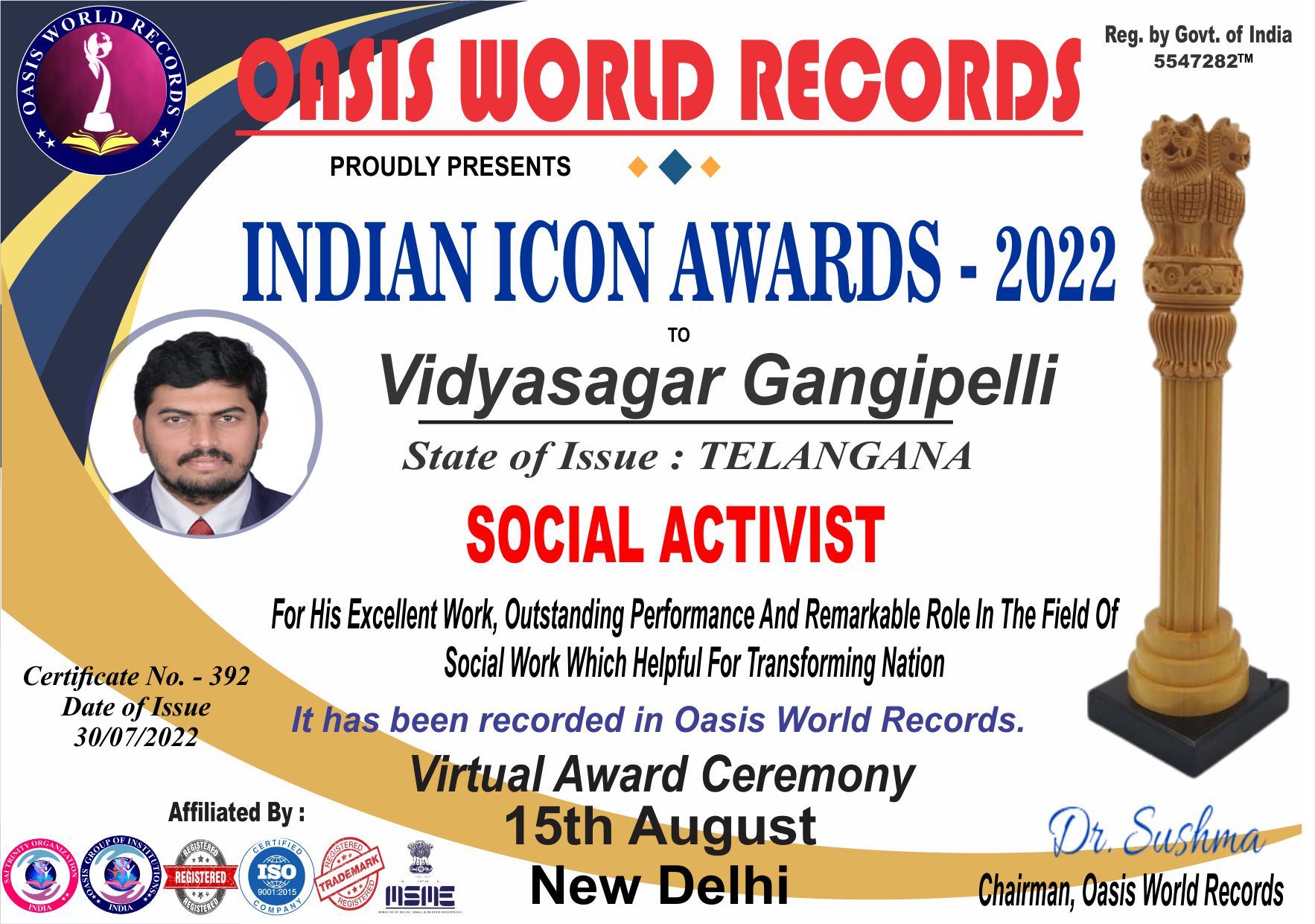 Indian Icon Award 2022 presented to Vidyasagar Gangipelli