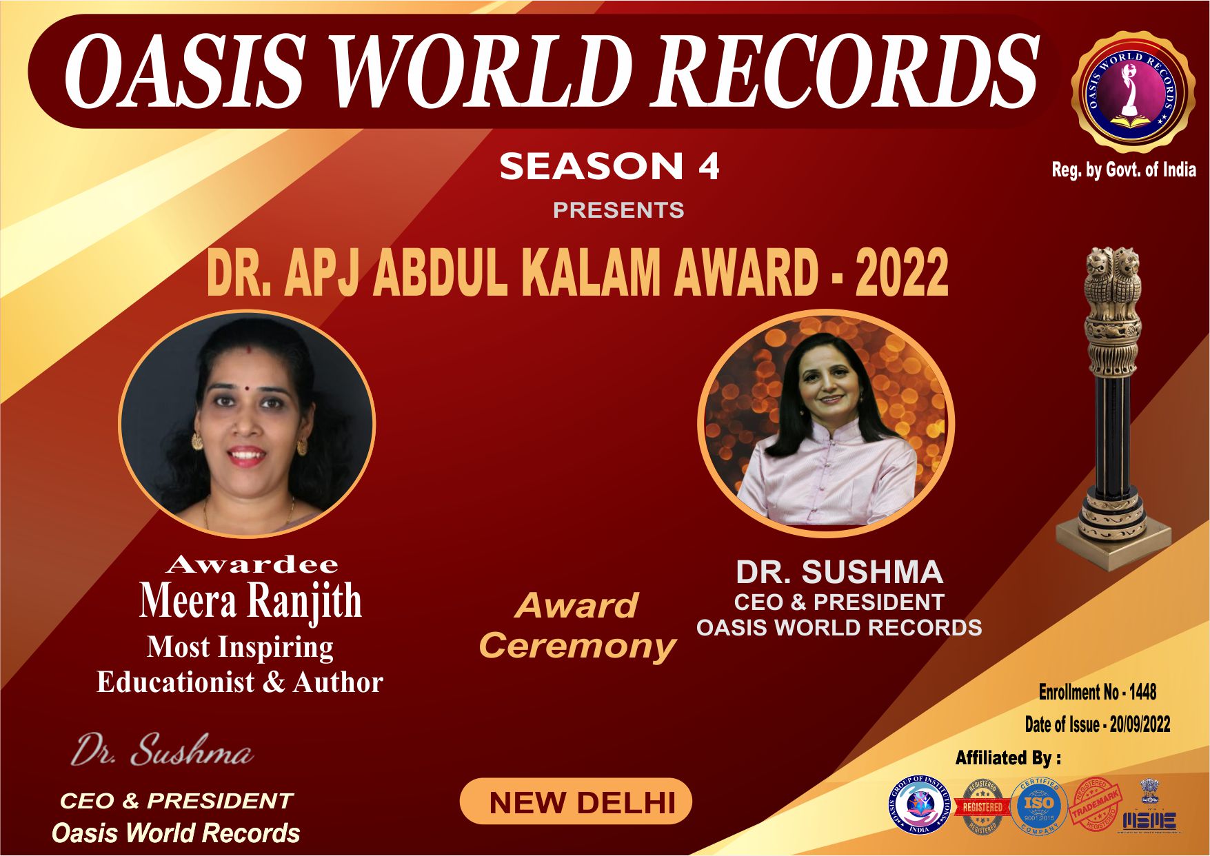 DR. APJ Abdul Kalam Award is presented  to Meera Ranjith for her excellent work, outstanding performance and remarkable role in the field of Publication & Education which is helpful in transforming the Nation.