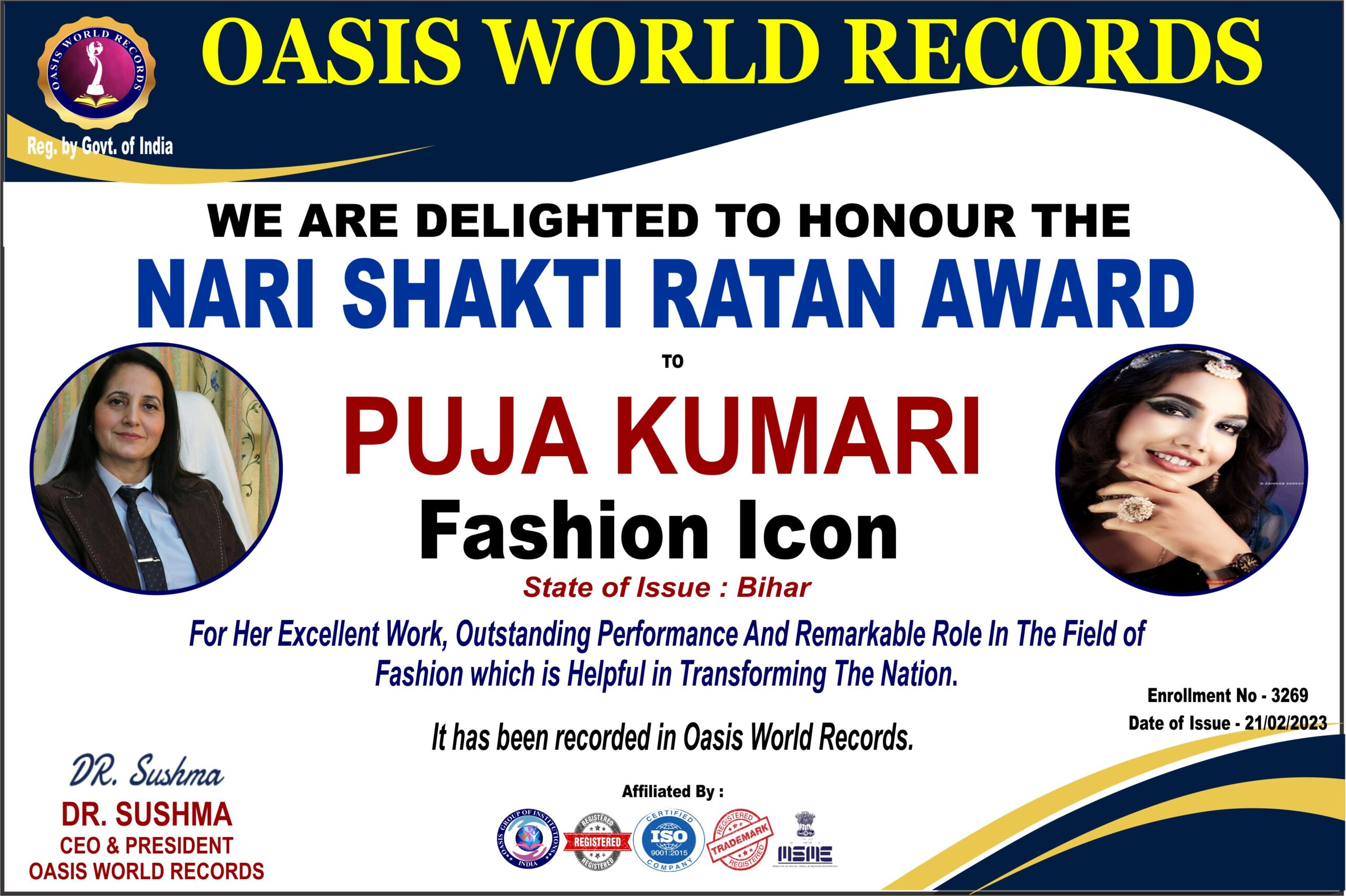 For Her Excellent Work, Outstanding Performance And Remarkable Role In The Field of Fashion which is Helpful in Transforming The Nation.